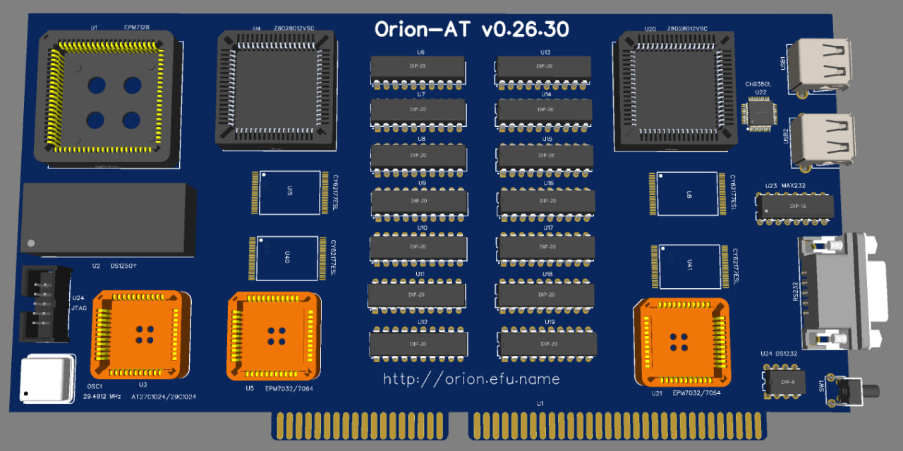 Кварцевый генератор, 2 процессора: один для ОС и приложений второй для обслуживания железа и эмуляции (Ориона, РК86, Специалист, ZX). ПЗУ 128 КБ AT27C1024-70PU, ОЗУ от 2 до 8 МБ на каждый проц