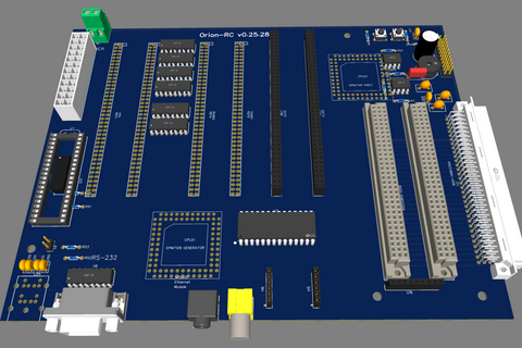 Плата остаётся под ATX корпус с слотами DIN, но добавлены разъёмы под модули RC2014. Так-же остаются схема видеовывода, дешифраторы.